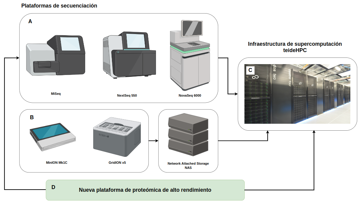 Estas plataformas de alto rendimiento, genómica y proteómica, se interconectan con la infraestructura de supercomputación del ITER, teideHPC, lo que facilita su almacenamiento durante plazos determinados y permite la realización de tareas de cómputo bioinformático. Para saber más sobre estas infraestructuras, haga clic aquí (https://teidehpc.iter.es/). También se puede acceder a los servicios de la infraestructura de HPC de forma independiente (https://teidehpc.iter.es/servicios/).