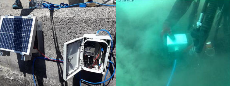 En la imagen se puede observar el resultado de la instalación del nodo central junto al módulo fotovoltaico en la pared del muelle (a la izquierda) y el nodo satélite y el piezómetro siendo instalados por el equipo de buzos profesionales (a la derecha).