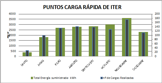 Durante el año 2022 los puntos de carga rápida para vehículos eléctricos ubicados en las instalaciones del ITER han sido visitados por el público en 995 ocasiones ofreciendo un suministro superior a los 20.000 kWh de energía limpia con origen renovable.