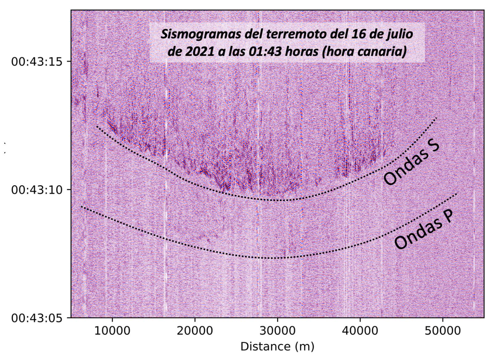 En la segunda figura se muestran los sismogramas de este terremoto registrado por el sistema DAS a lo largo de los primeros 55 km de cable submarino. En esta figura se evidencia la llegada de las ondas P y S producidas por el terremoto.
