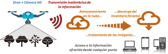 La solución planteada consta de un dron con una cámara de alta definición implementada, de forma que, tras la captura de diferentes imágenes tomadas durante el vuelo del dron, se proceda al tratamiento de las mismas, obteniendo gracias a la algoritmia desarrollada las diferentes características de la masa forestal, las cuales conformarán un inventario forestal.