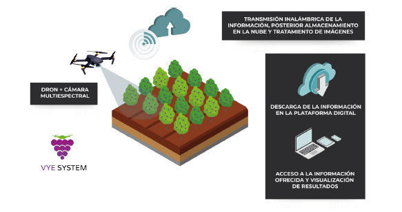 Para lograr el objetivo descrito, se diseñará como solución el nuevo sistema VYE SYSTEM, basado en la utilización de aeronaves no tripuladas o “drones”, con cámaras multiespectrales incorporadas para la captura de información mediante imágenes, las cuales serán procesadas mediante una compleja algoritmia calculando diferentes parámetros e índices vinculados con el nivel de rendimiento de los cultivos. Para poder realizar esta tarea, la algoritmia estará compuesta también por redes neuronales, las cuales se entrenarán en campo con el cálculo de parámetros espectrales y el contraste de estos con los rendimientos de cultivos registrados. Una vez procesados los datos y obtenido el resultado, se generará un mapa de rendimientos el cual se podrá visualizar a través de la plataforma digital mediante distintos dispositivos.